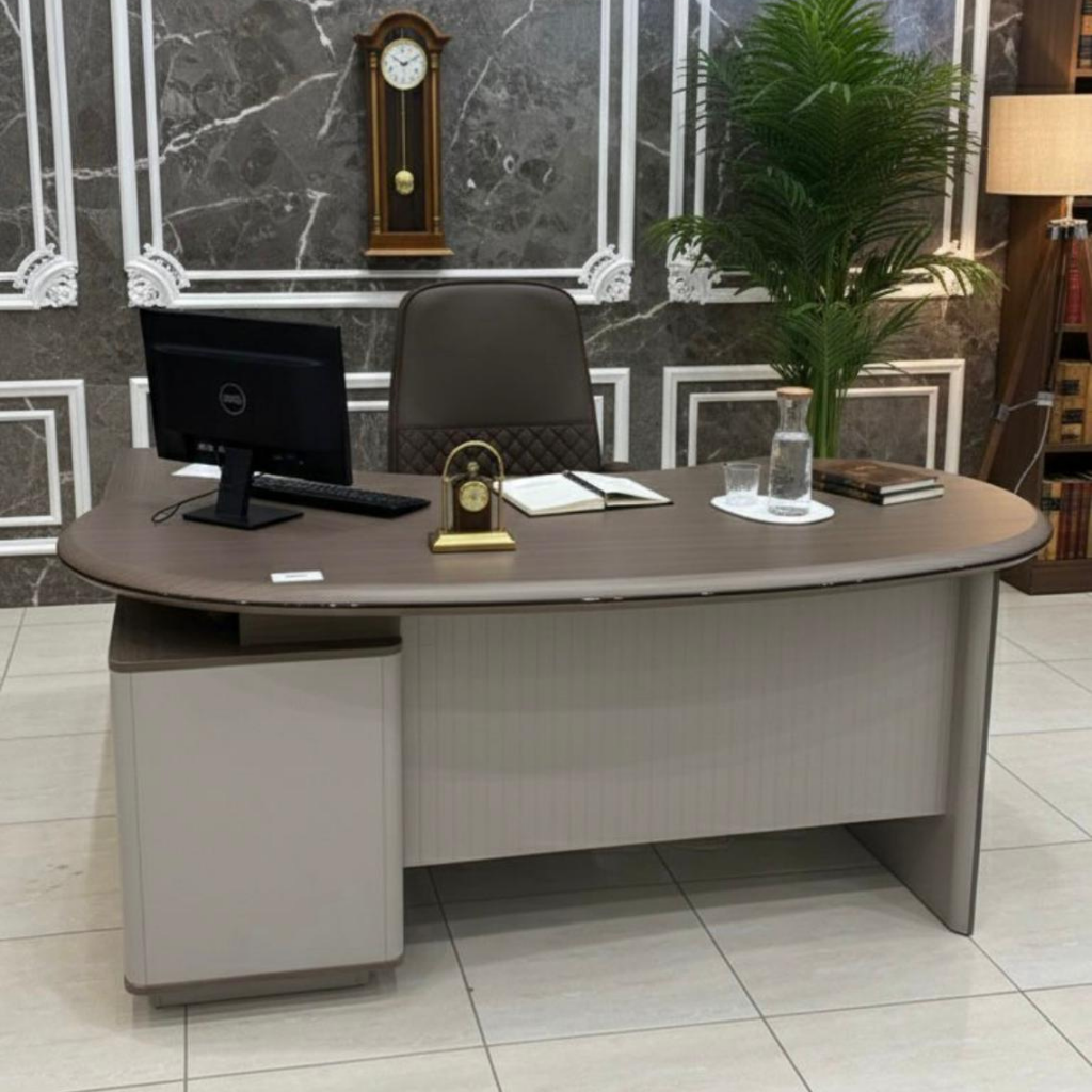 Aik premium aur majestic executive workstation jo 140cm, 160cm, aur 180cm sizes mein dastiyab hai. Is mein deep wood-grain finish curved tabletop aur aik elegant light gray-toned base ka classic combination hai. Integrated side return aapke documents, files, aur CPU ke liye wasee storage faraham karta hai.